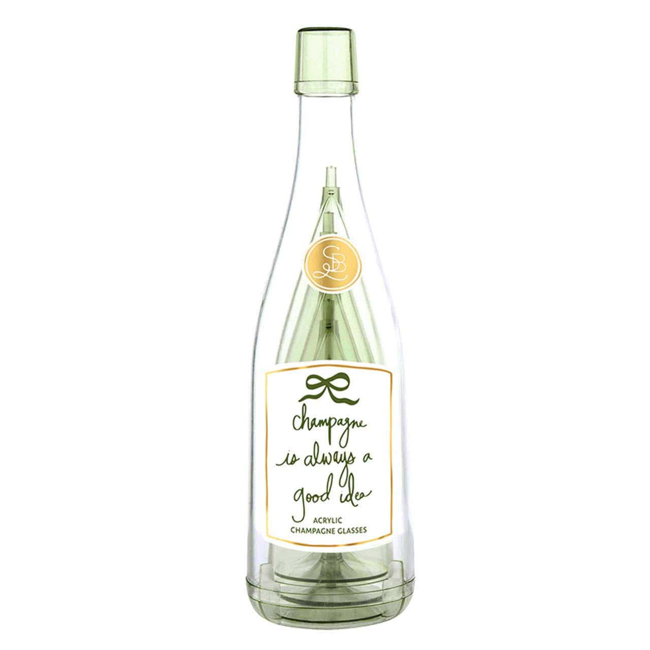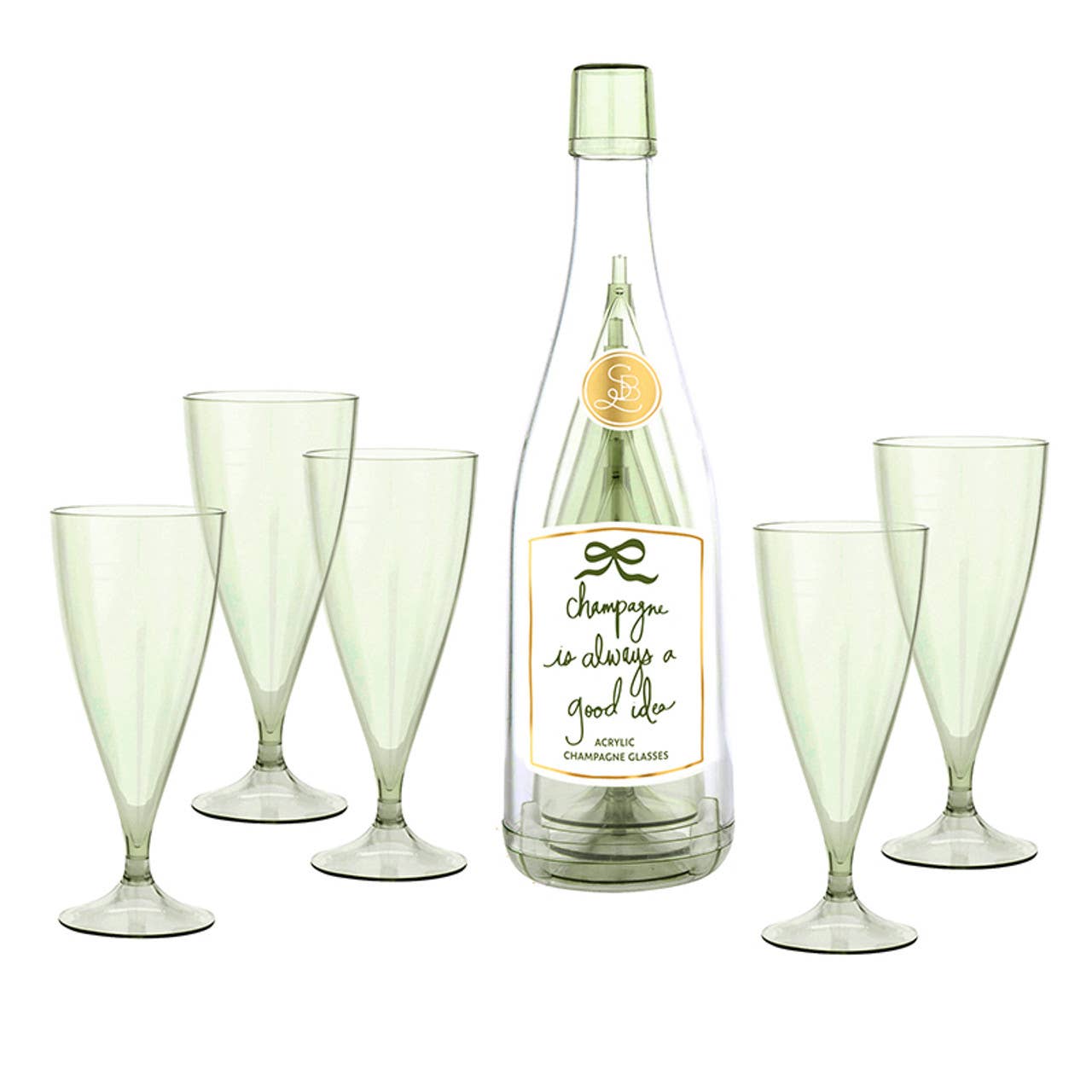 Elevate your birthday festivities (or any celebration!) with our Champagne Bottle Set, a fun and functional way to make every toast memorable. This unique set includes five stackable acrylic champagne glasses cleverly designed to nest together in the shape of a champagne bottle—combining playful design with effortless elegance.