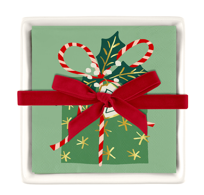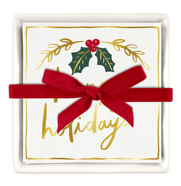 Elevate your entertaining experience with this Ceramic Napkin Tray with Paper Cocktail Napkins, a perfect blend of style and practicality. Designed to neatly hold and display cocktail napkins, this chic ceramic tray adds a refined touch to any table setting, whether you're hosting a dinner party, holiday gathering, or casual get-together. The clean lines of the ceramic tray offer timeless appeal, while the luxurious velvet ribbon detail brings a subtle hint of sophistication.