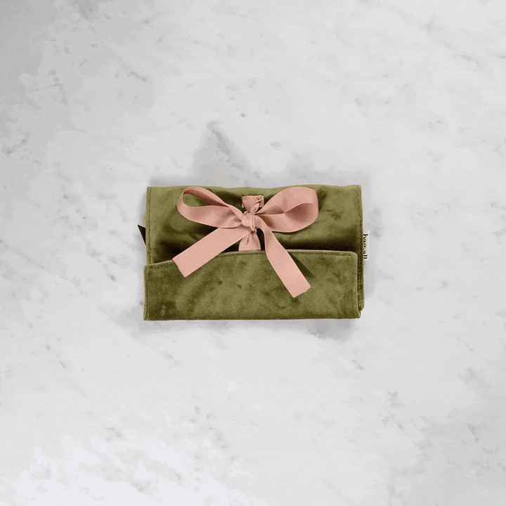 Green Velvet Jewelry Cases offer a sophisticated solution for organizing and protecting your cherished accessories. The Couture Jewelry Roll, crafted from eco-velvet, features three zipper compartments, a genuine leather earring holder, and a padded ring holder, ensuring your jewelry remains tangle-free and easily accessible.