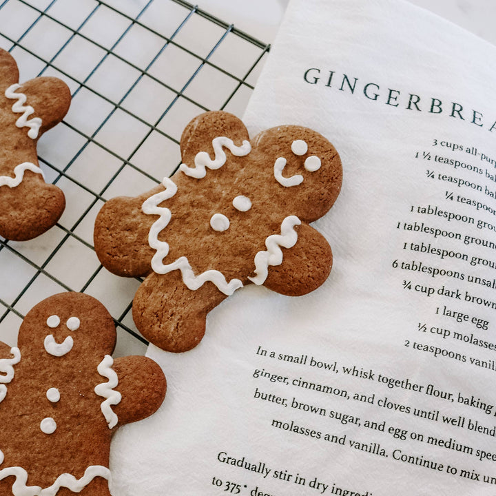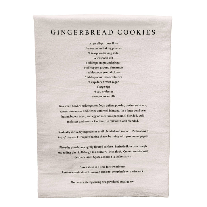 Introducing the Gingerbread Cookies Hand Towel, a delightful blend of functionality and festive charm. Measuring approximately 25 x 28 inches, this towel features a whimsical gingerbread cookie recipe printed on a cream background, making it a unique addition to your holiday kitchen decor.