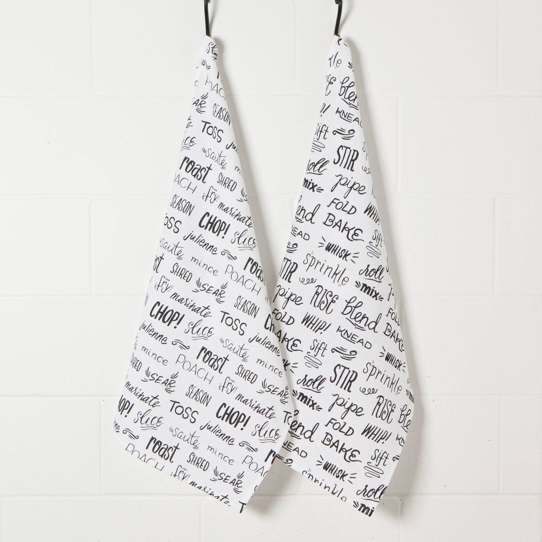Crafted from 100% cotton, each towel measures 20 x 30 inches, providing ample coverage for all your kitchen tasks. The striking black text on a soft white background effortlessly complements any decor, enhancing your kitchen's aesthetic.