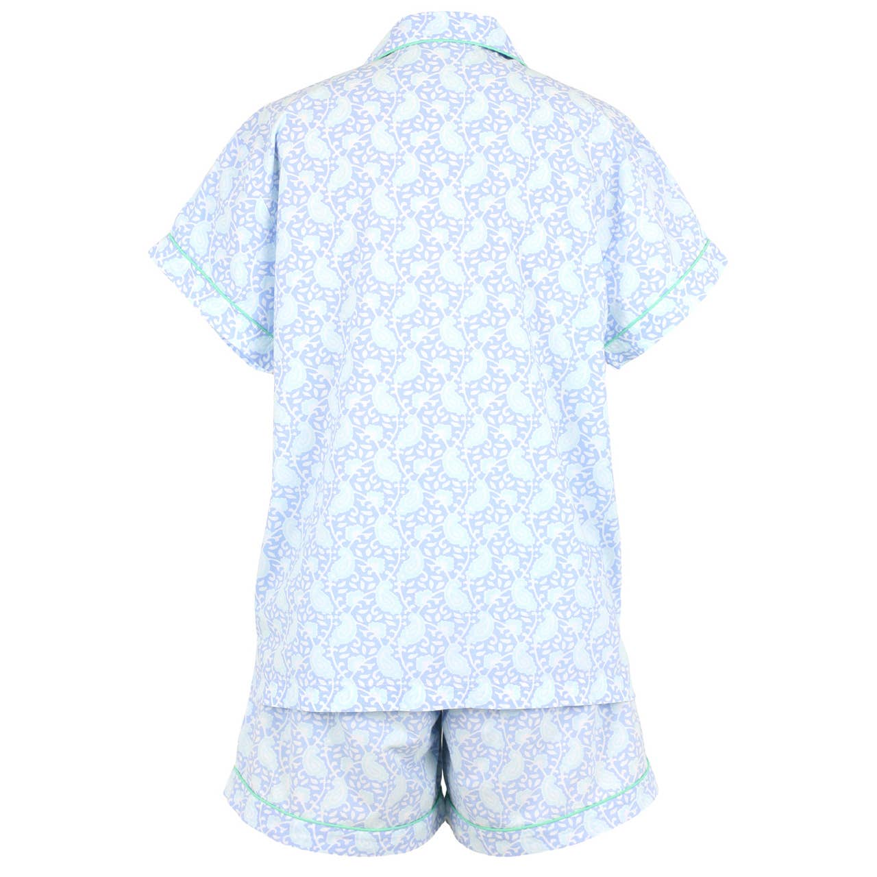 Designed for warm nights and effortless lounging, this short sleeve shorty pajama set blends classic tailoring with everyday comfort. The button-down top features short sleeves, a notched collar, a breast pocket, and subtle side slits for a relaxed, flattering fit. Finished with crisp mint green piping, it adds a fresh, refined touch to a timeless silhouette.