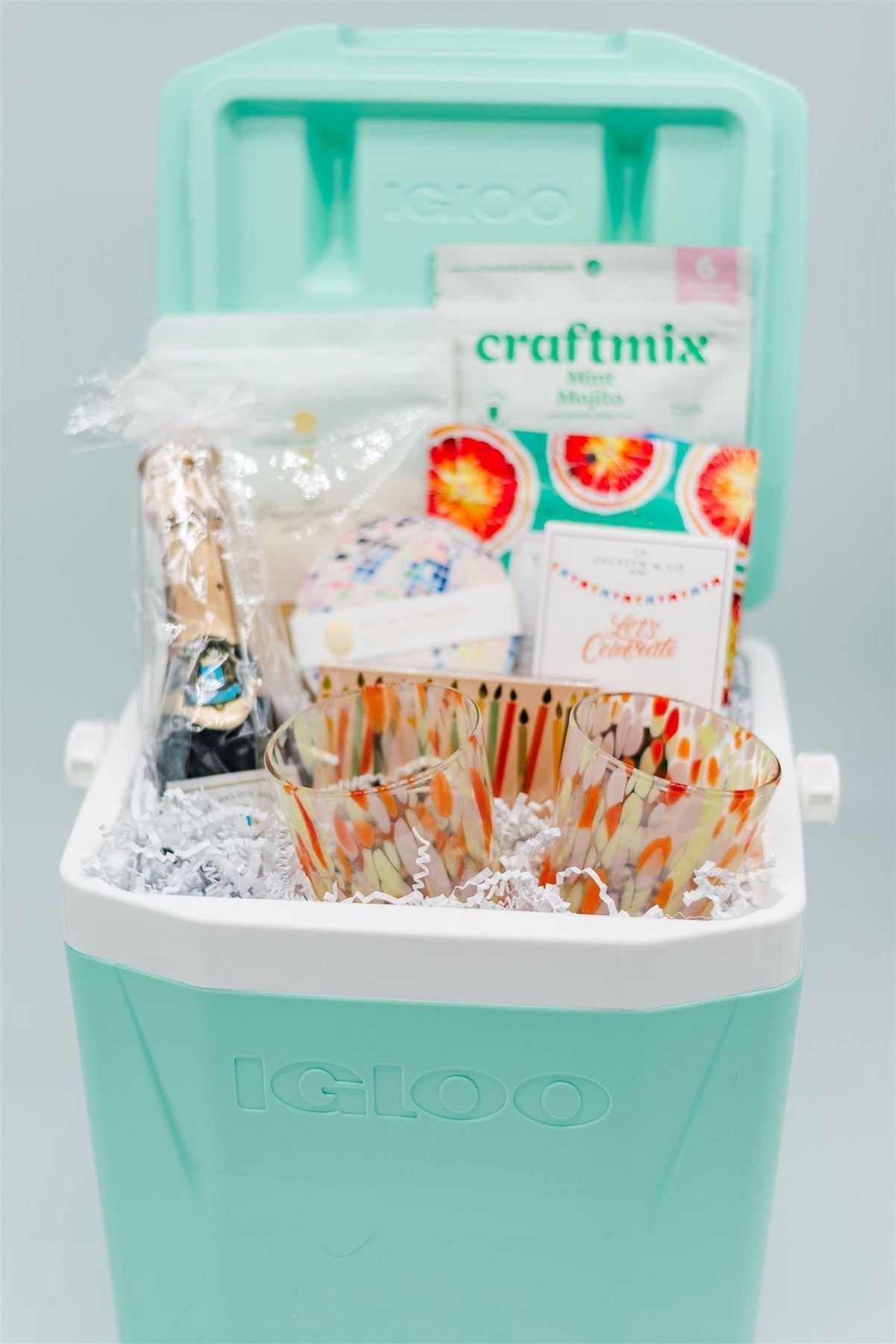 Upgrade the celebration with our optional pastel-colored Igloo cooler, which doubles as both a charming gift presentation and a functional keepsake. Perfect for future beach days, tailgates, or picnics, this retro-inspired cooler holds a twelve-pack of your favorite beverages and keeps the party going long after the last toast.