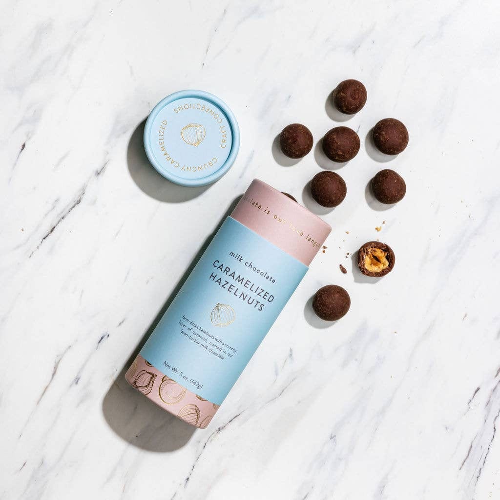 Discover the unique delight of our Milk Chocolate-Covered Caramelized Hazelnuts. Each 5oz bag is filled with award-winning flavors, crafted from farm-direct, organic hazelnuts and our signature bean-to-bar milk chocolate. The perfect caramelization process ensures a satisfying crunch, making every bite an indulgent experience.