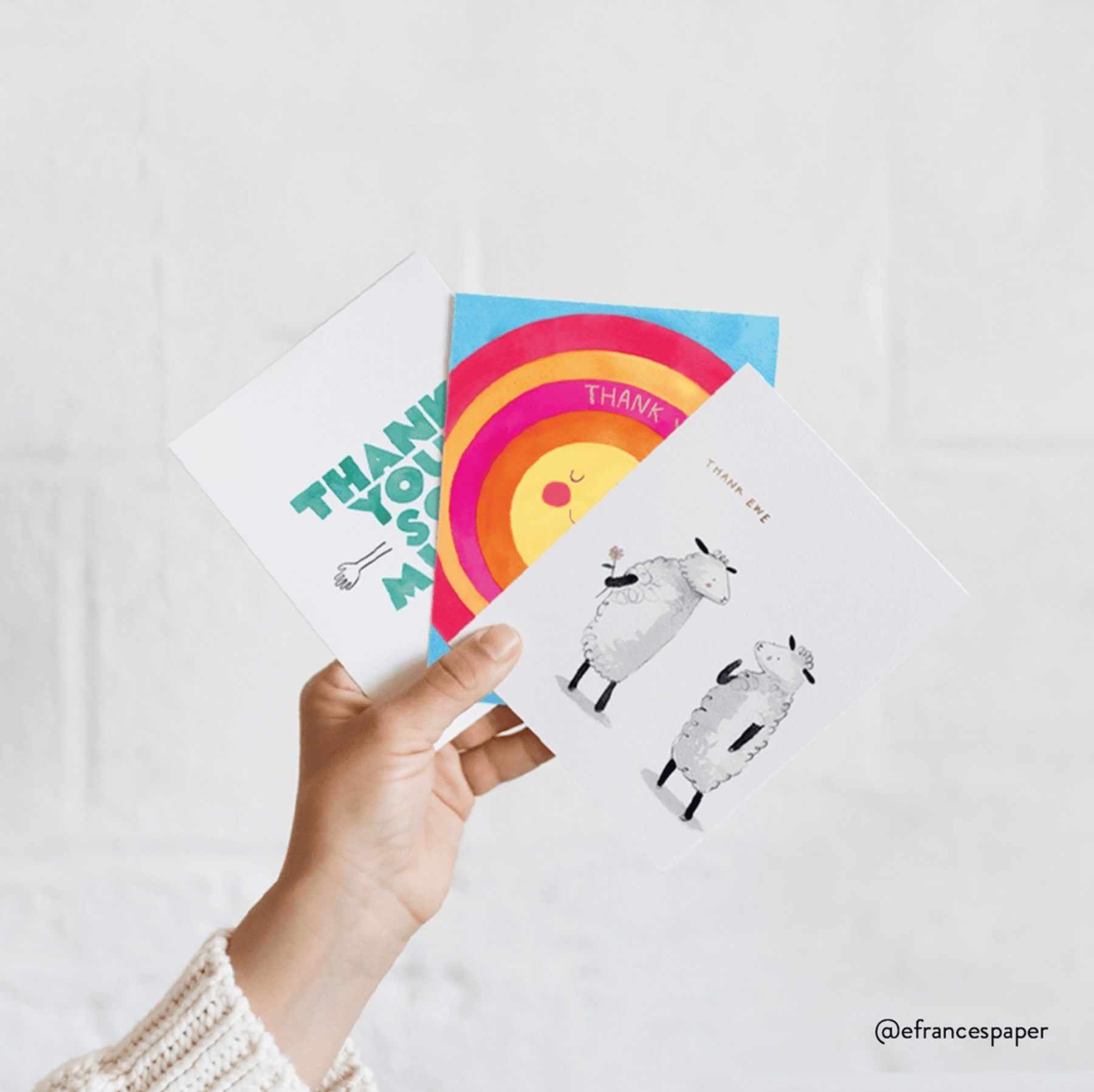 Thank you, ewe, you knew just what to do. Each E. Frances card begins as an original watercolor painting, and then is printed in brilliant color on luxe, heavyweight paper and kissed with gold foil.