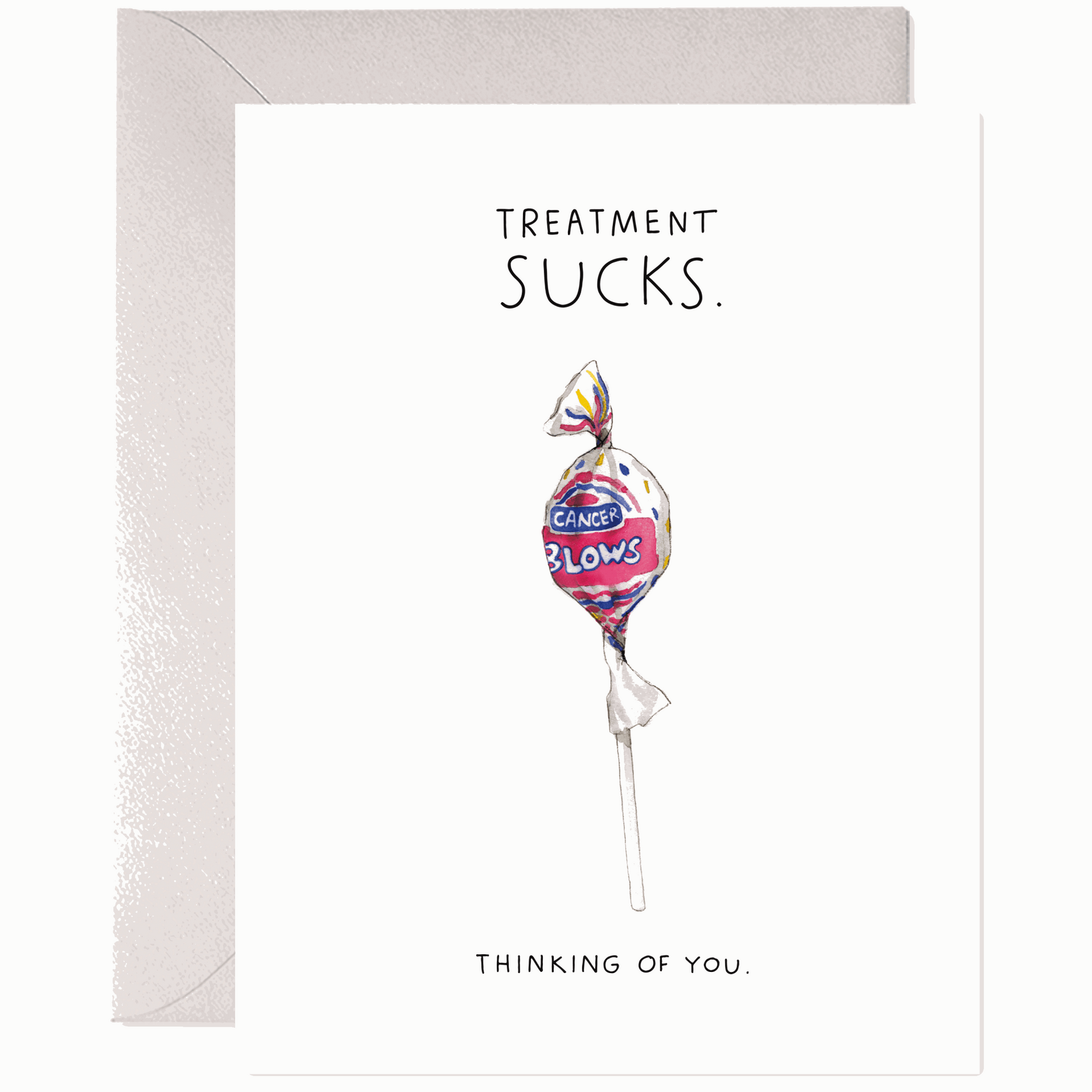 Introducing the 'Treatment Sucks | Thinking of You' greeting card, a heartfelt way to show you care. Each card is a unique creation, beginning as an original watercolor painting that captures emotion and artistry.