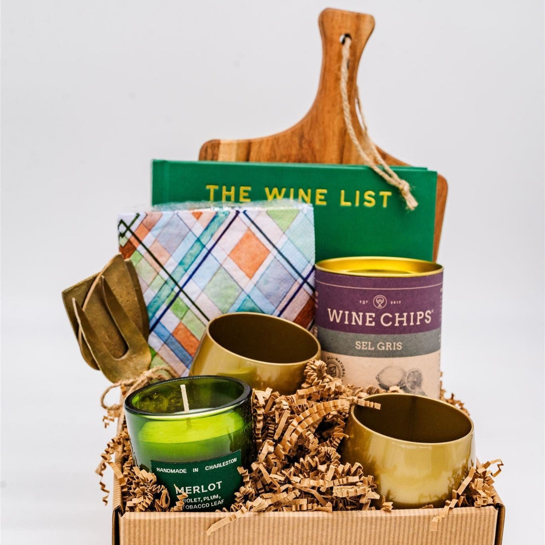 Inside, you'll find The Wine List gift book—a beautifully illustrated guide to wine tasting and pairing—alongside two unbreakable wine glasses, perfect for indoor or outdoor enjoyment. Set the scene with a stylish charcuterie board and gleaming brass utensils, ideal for serving up your favorite meats and cheeses. A merlot-scented soy candle adds a warm, aromatic touch, while cocktail napkins and savory wine chips complete the experience.